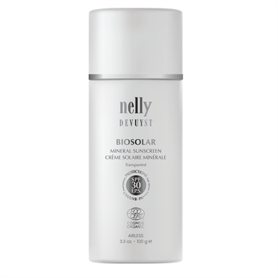 Nelly De Vuyst® is proud to present our new BioSolar Mineral Sunscreen SPF 30: the first translucent mineral sunscreen, nanoparticle-free and Certified COSMOS Organic by Ecocert Greenlife. This broad-spectrum sunscreen is anti-aging and offers triple protection against UVA/UVB rays and urban and digital pollution.